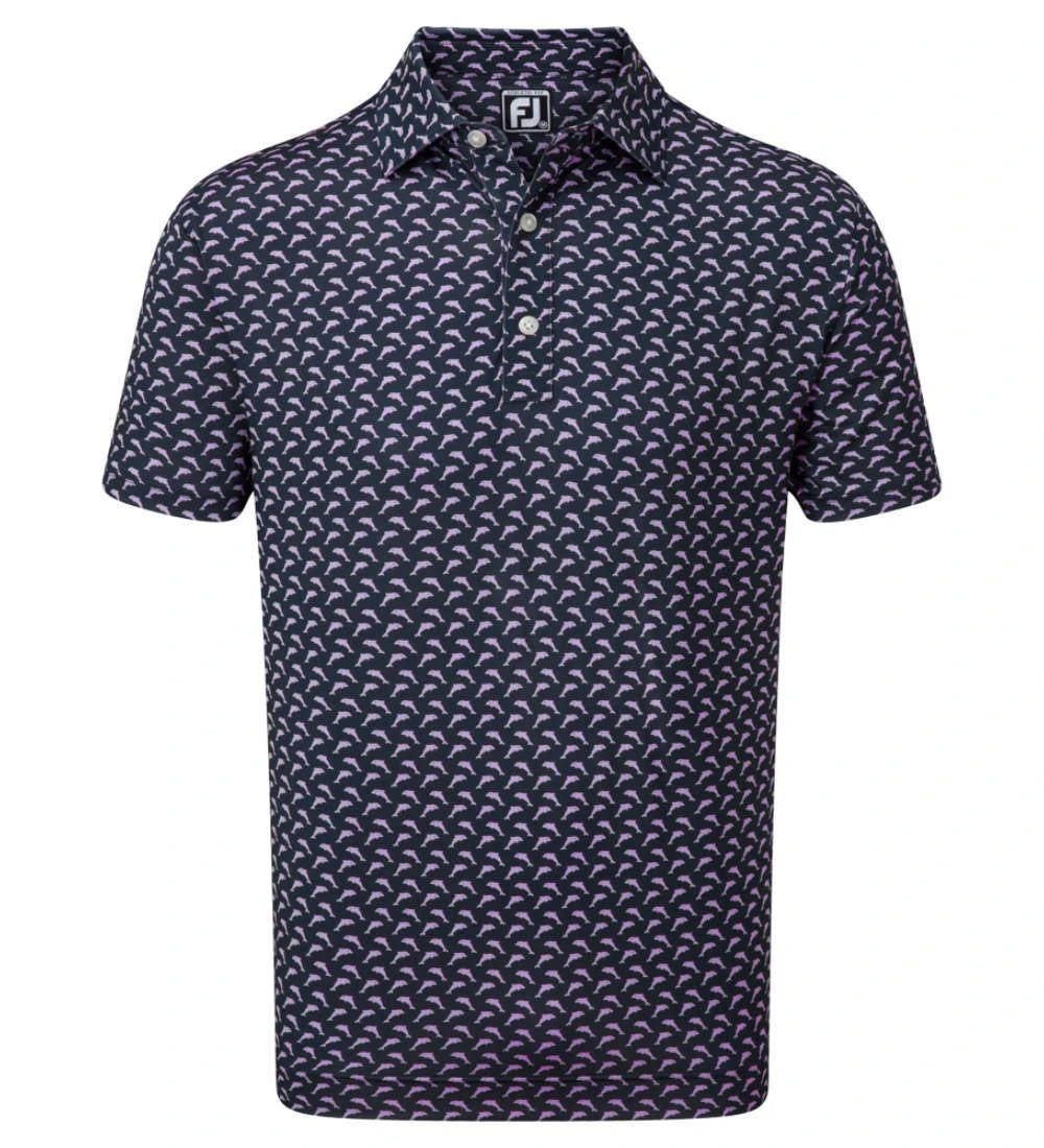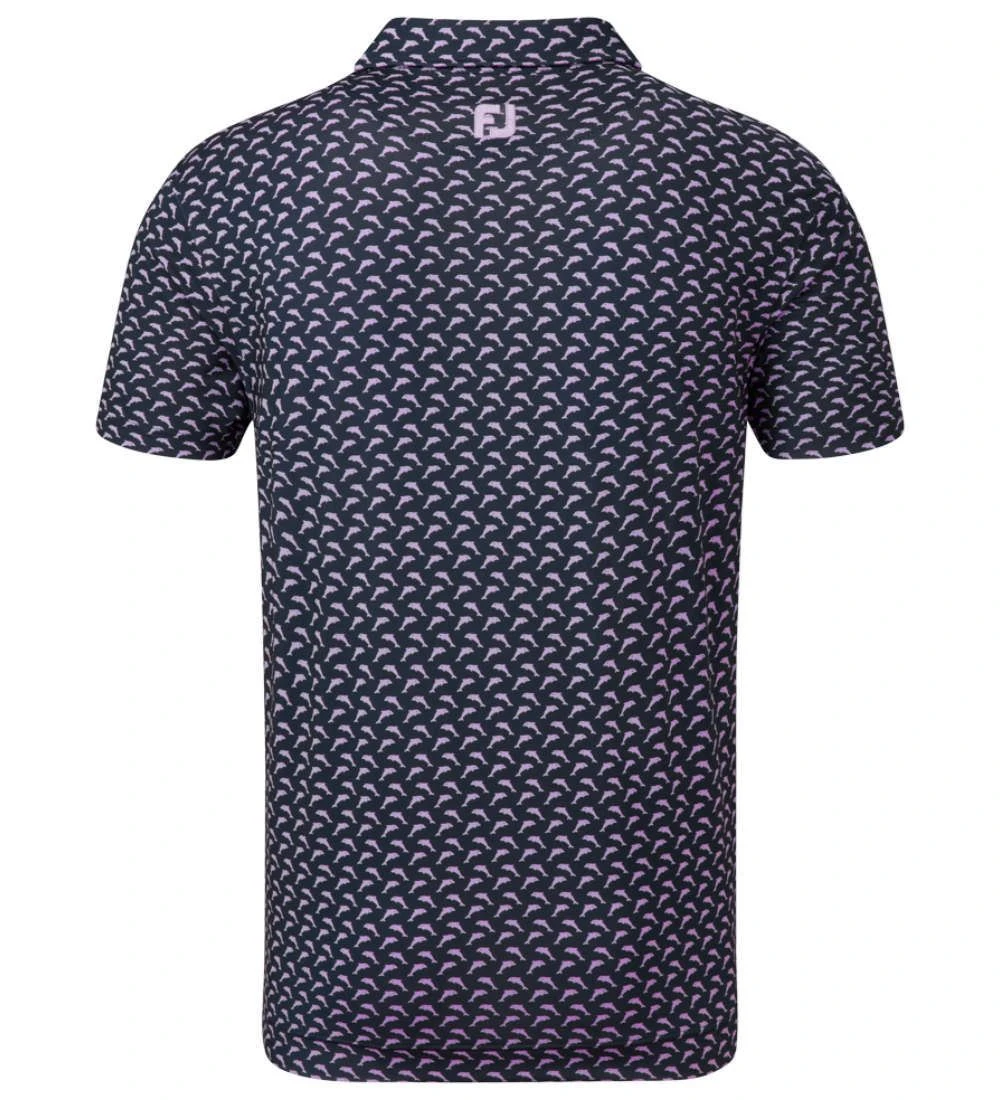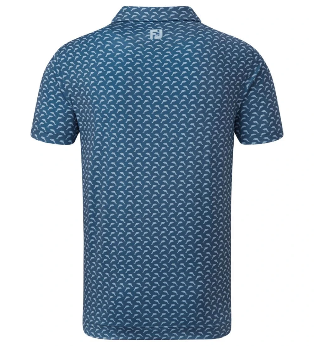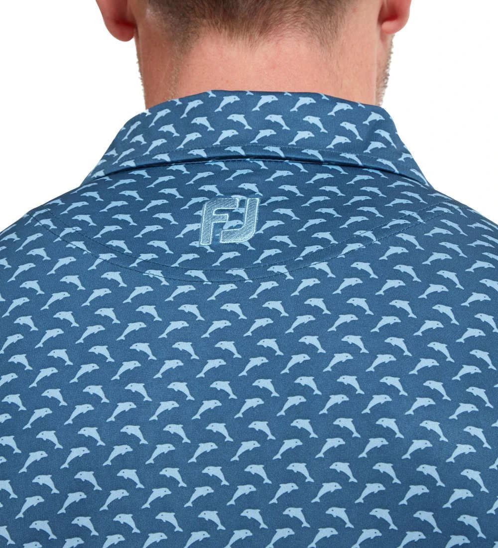 FJ ProDry Lightweight Stretch Lisle fabric. All over dolphin print pattern. Colour-coordinate rear yoke FJ logo. Moisture-wicking technology draws moisture away from the body. Easy care fabric to minimise wrinkling. SPF 30 UV protection