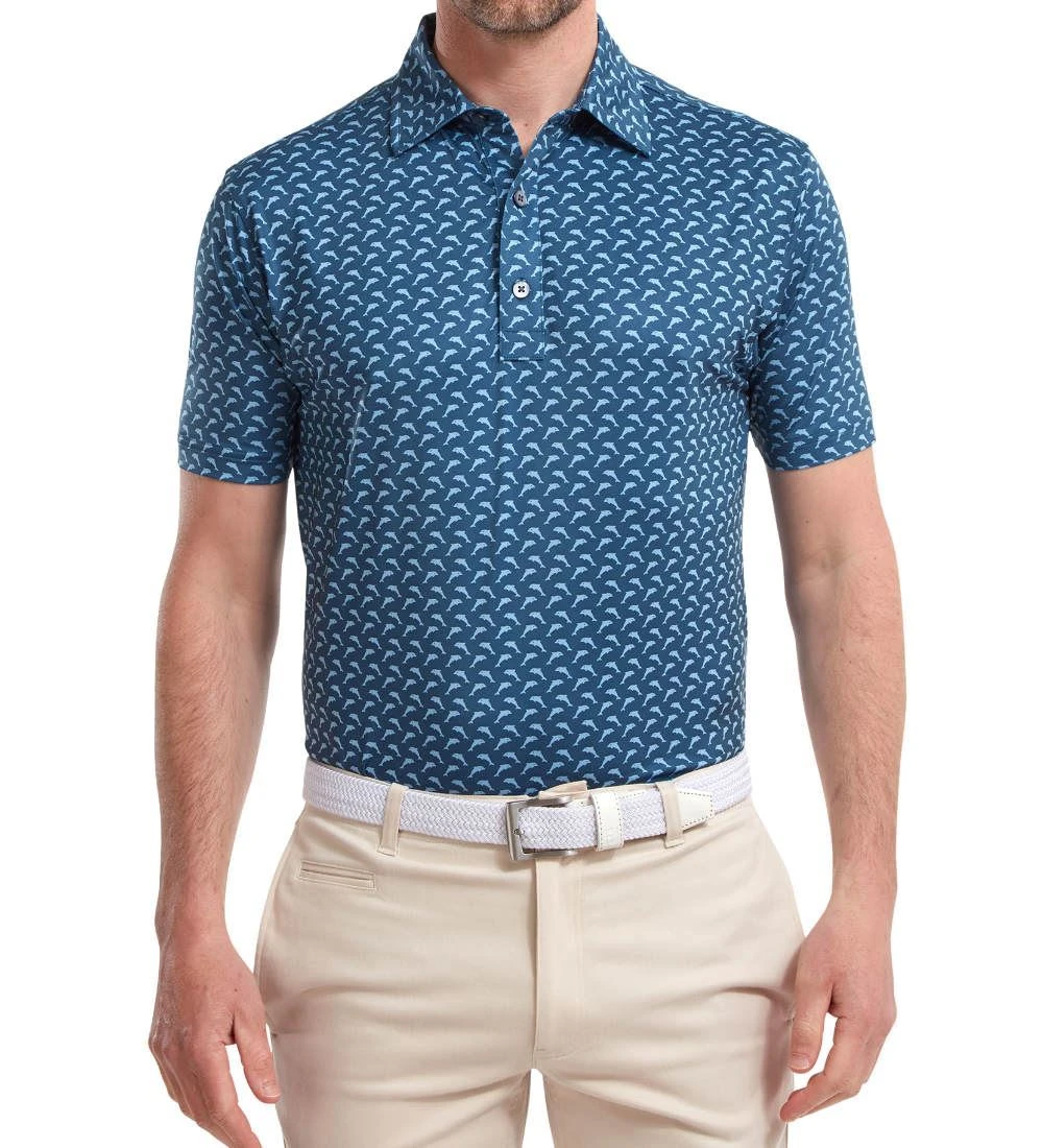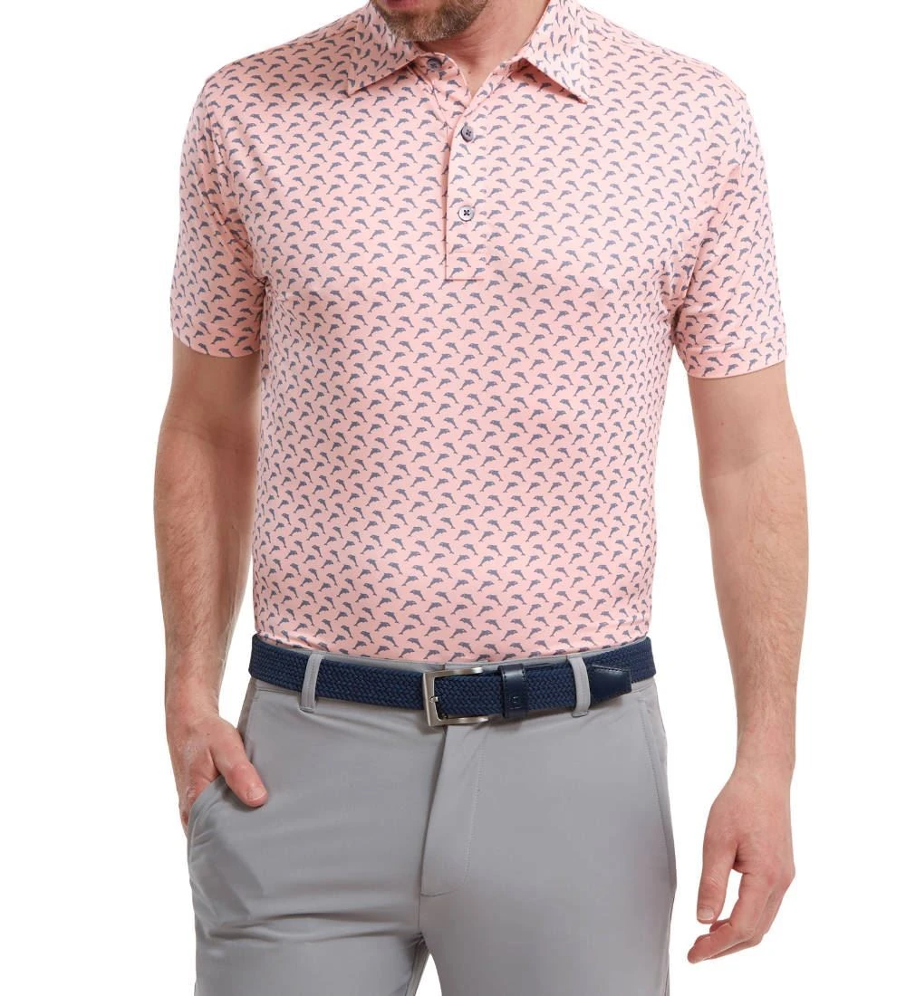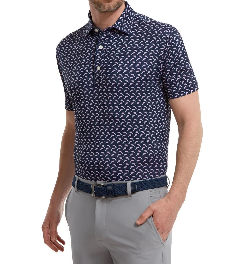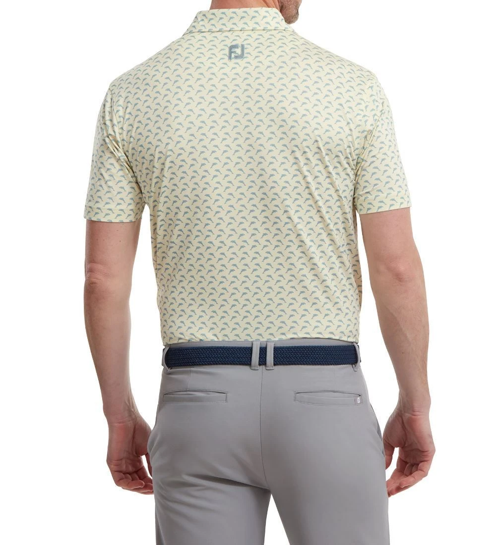FJ ProDry Lightweight Stretch Lisle fabric. All over dolphin print pattern. Colour-coordinate rear yoke FJ logo. Moisture-wicking technology draws moisture away from the body. Easy care fabric to minimise wrinkling. SPF 30 UV protection