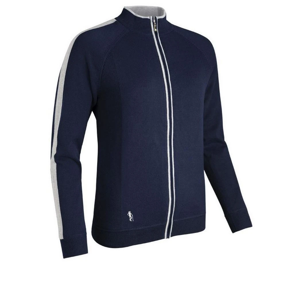Whatâs a bit of a blow when youâve got golf to play? Pay no attention to blustery, windy days when youâre wearing the ladiesâ Adalyn lined cotton golf sweater! This zip front jumper is pure, 100% combed cotton outside, in a sophisticated fine gauge design, fully fashioned and with ribbed-knit side panels, contrast tipping and striped detailing to the sporty raglan sleeves. Inside the sweater, weâve added a light, soft yet protective stretch lining that is wind resistant and moisture-wicking. Itâs also Scotchgard treated against staining. The full-zip front has a diamantĂ© detail zip pull, so you can zip up against sudden breezes or leave loose when play heats up!