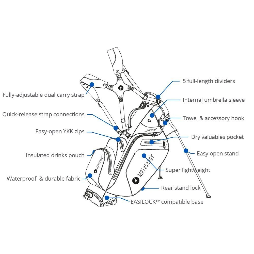 - Fits perfectly onto any Motocaddy trolley, works effectively as both a stand bag and cart bag