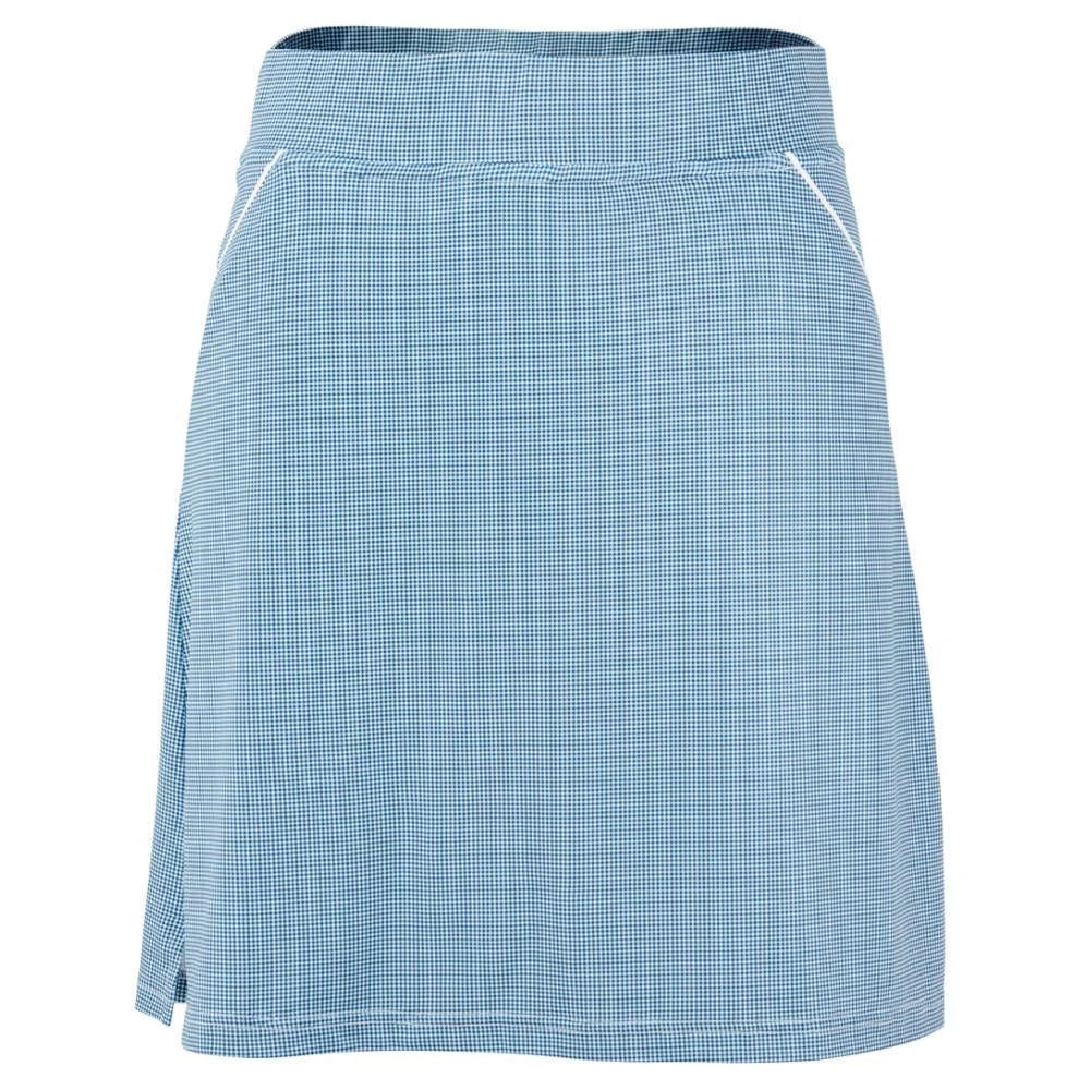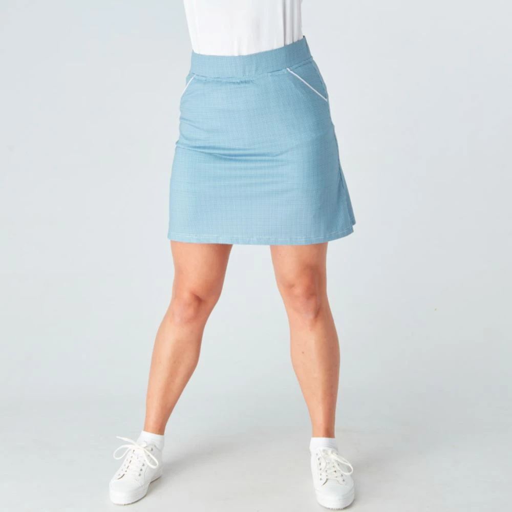 The classic pull-on high stretch skort in this season’s gingham and 47cm in length (average). So easy to wear, slim fit, slightly higher waist with lots of stretches but very forgiving. Front and back pockets. We wear ours both on and off the course.